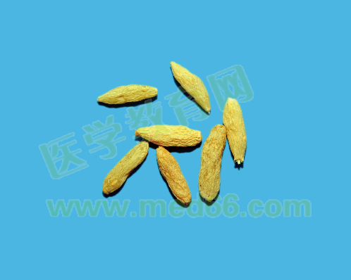 呈紡錘形,兩端略尖。表面黃白色或淡黃色,有細縱皺紋。質(zhì)柔韌,斷面黃白色,半透明,中柱細小。氣微香,味甘、微苦。