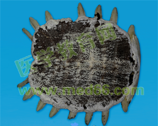 呈橢圓形或卵圓形,背面隆起。外表面黑褐色或墨綠色,略有光澤,具細網(wǎng)狀皺紋和灰黃色或灰白色斑點,中間有一條縱棱,兩側各有左右對稱的橫凹紋8條,外皮脫落后,可見鋸齒狀嵌接縫。內(nèi)表面類白色,中部有突起的脊椎骨,頸骨向內(nèi)卷曲,兩側有對稱的肋骨各8條,伸出邊緣。質(zhì)堅硬。氣微腥,味淡。