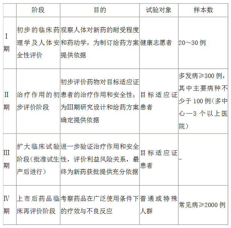 (1)上市前藥物臨床評(píng)價(jià)階段:臨床試驗(yàn)Ⅰ、Ⅱ、Ⅲ期。