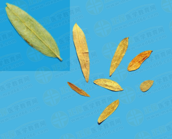 狹葉番瀉:呈長(zhǎng)卵形或卵狀披針形,葉端急尖,葉基稍不對(duì)稱,全緣。上表面黃綠色,下表面淺黃綠色,無(wú)毛或近無(wú)毛,葉脈稍隆起。革質(zhì)。氣微弱而特異,味微苦,稍有黏性。
