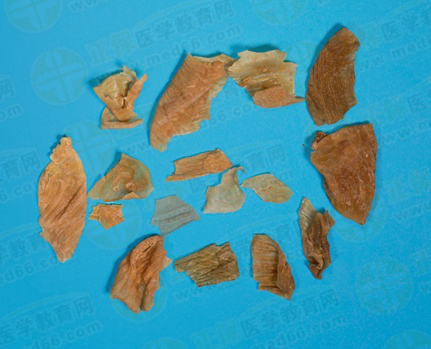 表面薄而半透明,具明顯的條狀皺紋。質(zhì)脆,易碎,斷面角質(zhì)樣,有光澤。氣微腥,味微苦。