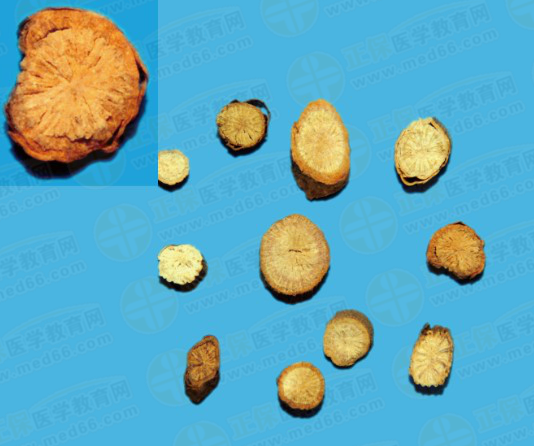 呈圓柱形,稍彎曲。表面棕褐色,粗糙,有縱溝及皺紋,并有須根痕及橫長的皮孔樣突起,有的外皮易脫落。質(zhì)硬而脆,易折斷,斷面粉白色或粉紅色,皮部窄,木部放射狀紋理明顯,有的有裂隙。氣微香,味微苦、酸澀。