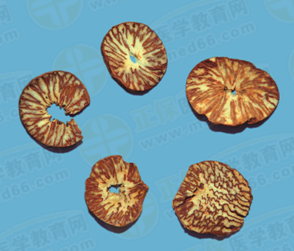 飲片檳榔:呈類圓形的薄片。切面可見棕色種皮與白色胚乳相間的大理石樣花紋。氣微,味微澀、微苦。
