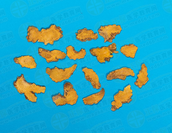 呈不規(guī)則的結(jié)節(jié)狀。表面黃褐色、棕褐色或黑褐色,皺縮,有較密的環(huán)紋。上面有數(shù)個圓盤狀凹陷的莖痕,偶有莖基殘存;下面有殘留的細根及根痕。質(zhì)硬,斷面黃色,顆粒性。氣微,味苦、微辛。