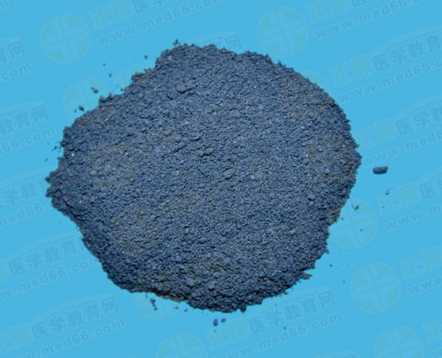 為深藍(lán)色的粉末,體輕,易飛揚(yáng);或呈不規(guī)則多孔性的團(tuán)塊、顆粒,用于搓捻即成細(xì)末。微有草腥氣,味淡。取藥材少量,用微火灼燒,有紫紅色煙霧發(fā)生。取本品少量,滴加硝酸,產(chǎn)生氣泡并顯棕紅色或黃棕色。