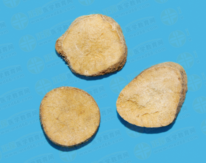 藥材呈類球形、橢圓形或卵圓形,表面淡黃色至淡黃棕色,有不規(guī)則的橫向環(huán)狀淺溝紋和多數(shù)細小突起的須根痕,底部有的有瘤狀芽痕。質(zhì)堅實,斷面黃白色,粉性,有多數(shù)細孔。氣微,味微苦。