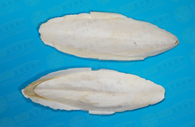 藥材無針烏賊:呈扁長橢圓形,中間厚,邊緣薄,背面有瓷白色脊?fàn)盥∑?,兩?cè)略顯微紅色,腹面白色,自尾端到中部有細(xì)密波狀橫層紋,尾部較寬平,無骨針。體輕,質(zhì)松,易折斷,斷面粉質(zhì),顯疏松層紋。氣微腥,味微咸。