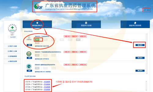 選擇【廣東省藥師協(xié)會】及勾選學習年份進行報名(如需補學,可同時勾選多個學習年份),會跳轉(zhuǎn)到協(xié)會網(wǎng)站,在“課程學年”列表即有相應年份選擇。