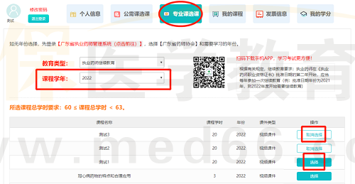 點擊【專業(yè)課選課】,選擇需要學習的【課程學年】,按照提示要求進行課件選擇,可以根據(jù)自己的需要自由選擇課件。
