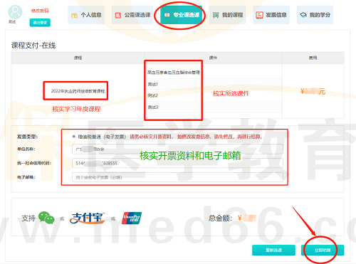 再次核對課程年份和開票資料,填寫電子郵箱,點擊【立即結算】。