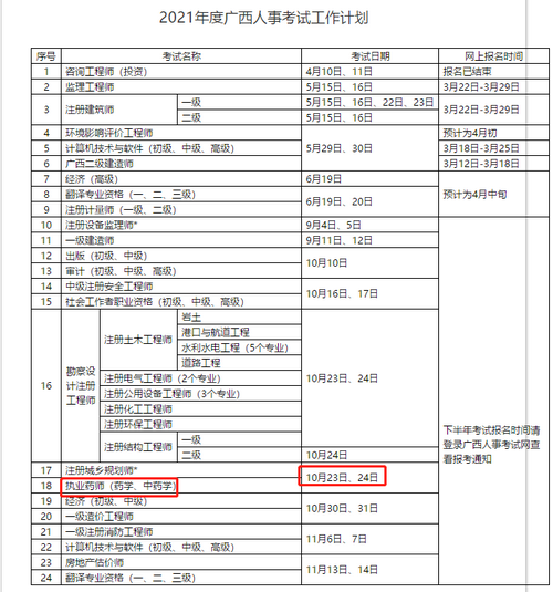 近日,廣西欽州市人民政府發(fā)布了《2021年度上半年廣西專業(yè)技術(shù)人員職業(yè)資格考試報名有關(guān)情況的通告》,雖然計劃主要是關(guān)于上半年考試,但是從中我們可以發(fā)現(xiàn),執(zhí)業(yè)藥師考試確定時間是在10月23、24日。