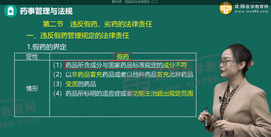 5.考試涉及“劣藥的界定”的內(nèi)容,老師講解中有涉及,具體考題及視頻截圖如下: