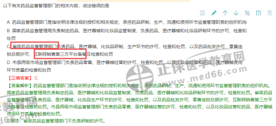 4.考試涉及“國家藥品監(jiān)督管理局職責(zé)”的內(nèi)容,老師講解中有涉及,具體考題及視頻截圖如下: