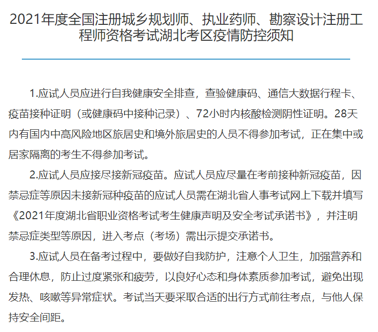 近日,湖北省人事考試網發(fā)布《2021年度全國注冊城鄉(xiāng)規(guī)劃師、執(zhí)業(yè)藥師、勘察設計注冊工程師資格考試湖北考區(qū)疫情防控須知》,詳情如下,請考生查看!