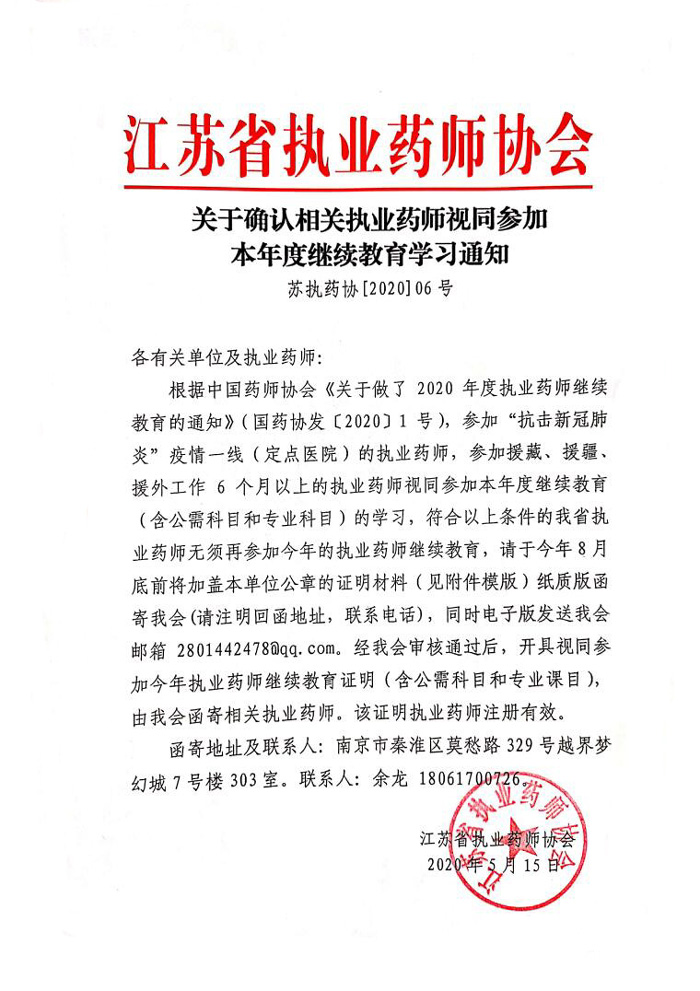 有關(guān)2020年執(zhí)業(yè)藥師繼續(xù)教育,針對(duì)參加過(guò)“抗擊新冠肺炎”疫情一線的執(zhí)業(yè)藥師,江蘇省有特殊政策!詳情如下,請(qǐng)江蘇省執(zhí)業(yè)藥師查看!