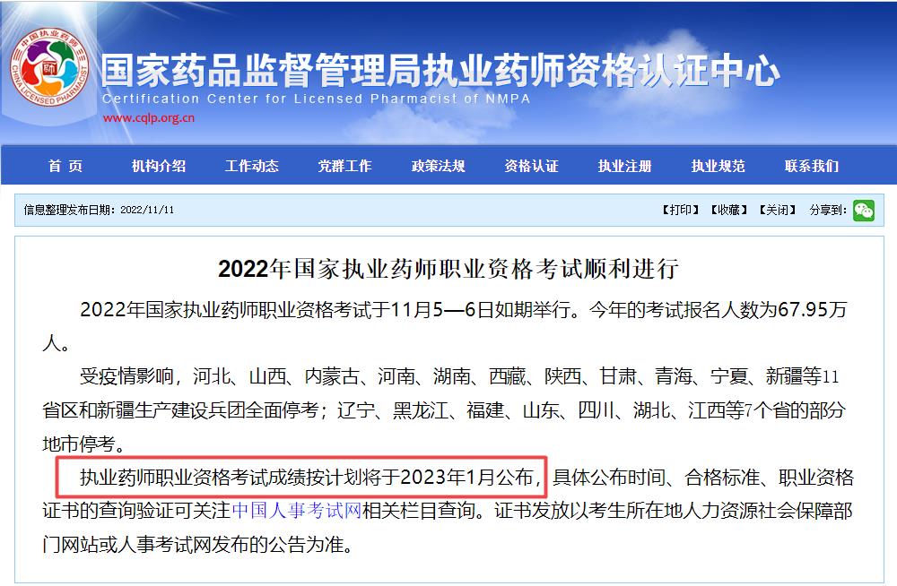2022年11月11日,國家藥品監(jiān)督管理局執(zhí)業(yè)藥師資格認(rèn)證中心官網(wǎng)發(fā)布通知:2022年執(zhí)業(yè)藥師考試成績發(fā)布時(shí)間預(yù)計(jì)在2023年1月份!