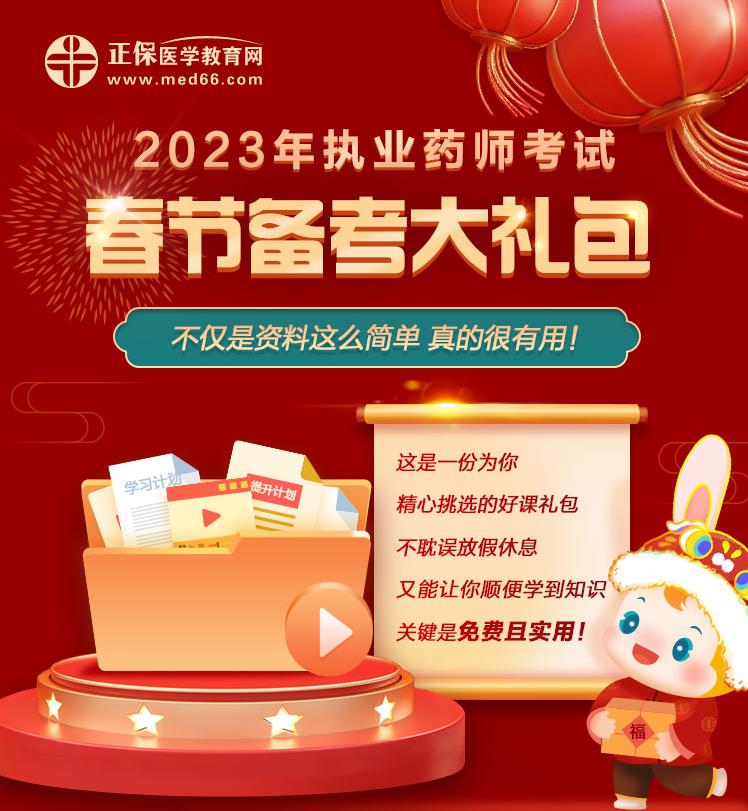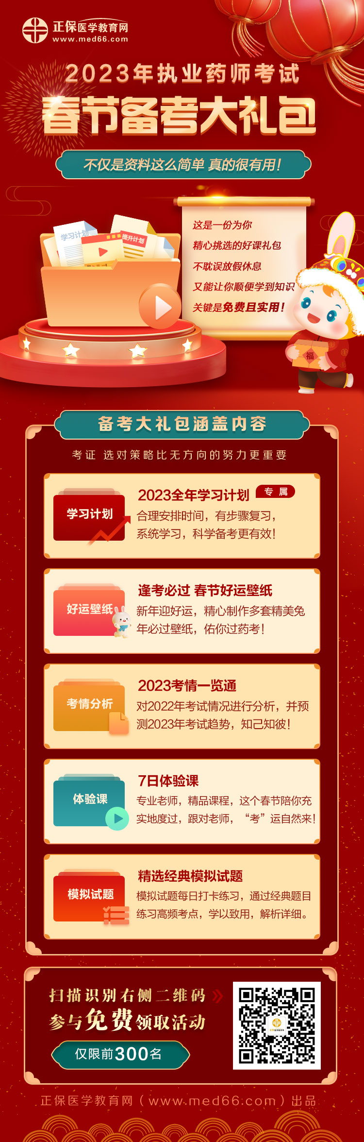 微信掃描下方二維碼,進(jìn)入正保醫(yī)學(xué)教育網(wǎng)執(zhí)業(yè)藥師官方公眾號(hào),發(fā)送關(guān)鍵詞【888】,即可領(lǐng)取兔年喜迎新春大禮包啦!兔年禮包添福氣,23年藥考快人一步!