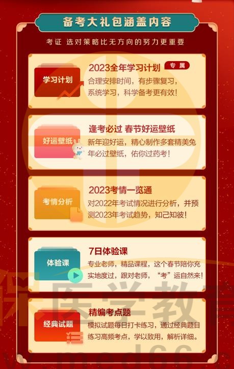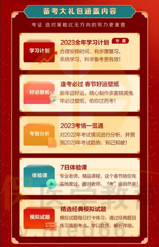 過(guò)年啦過(guò)年啦!醫(yī)學(xué)教育網(wǎng)和大家一起喜迎新春,新年快樂(lè)!在這闔家歡樂(lè)的日子里,醫(yī)學(xué)教育網(wǎng)攜精心準(zhǔn)備的新春大禮包來(lái)為大家添福氣啦!兔年有這一包就夠啦!話不多說(shuō),快來(lái)看看醫(yī)學(xué)教育網(wǎng)為大家準(zhǔn)備的這份驚喜吧!數(shù)量有限哦!不要猶豫啦!