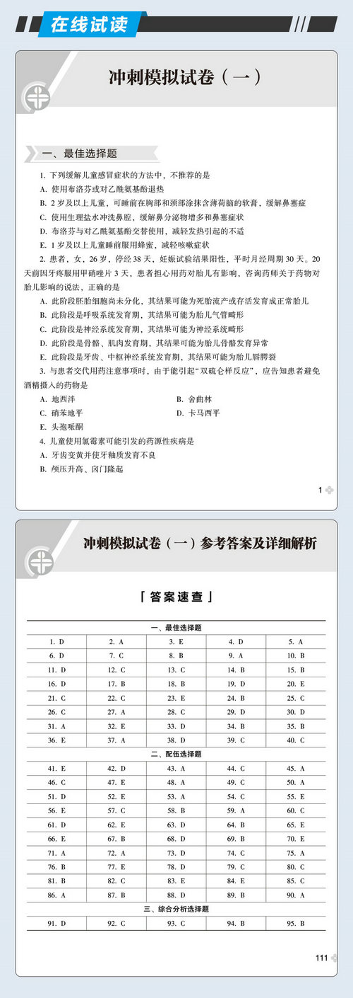 以上分享的“2023年執(zhí)業(yè)藥師《模擬試卷-藥綜》免費(fèi)試讀(5折搶購現(xiàn)貨)”內(nèi)容,由醫(yī)學(xué)教育網(wǎng)小編搜集整理,如果您覺得對您有所幫助,可以分享給朋友。想了解更多執(zhí)業(yè)藥師考試信息、復(fù)習(xí)資料、備考干貨請關(guān)注醫(yī)學(xué)教育網(wǎng)。