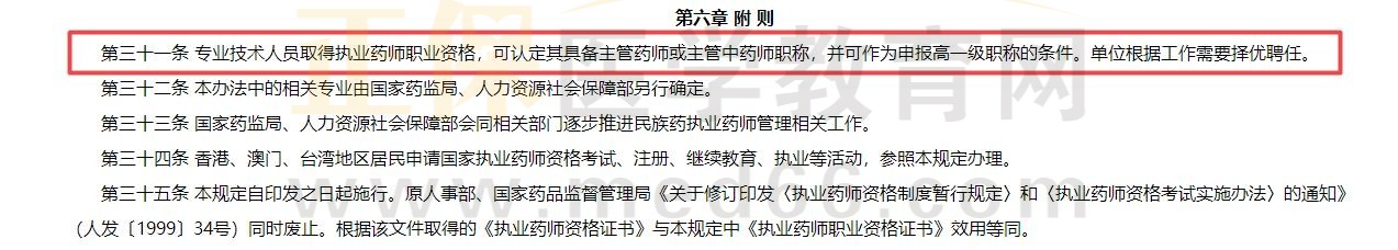 文中第31條執(zhí)業(yè)藥師職業(yè)資格制度規(guī)定表示:專業(yè)技術(shù)人員取得執(zhí)業(yè)藥師職業(yè)資格,可認(rèn)定其具備主管藥師或主管中藥師職稱,并可作為申報(bào)高一級職稱的條件。單位根據(jù)工作需要擇優(yōu)聘任。