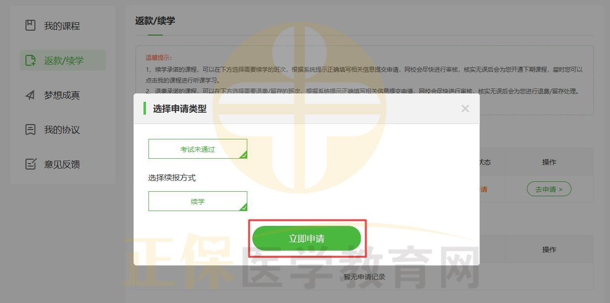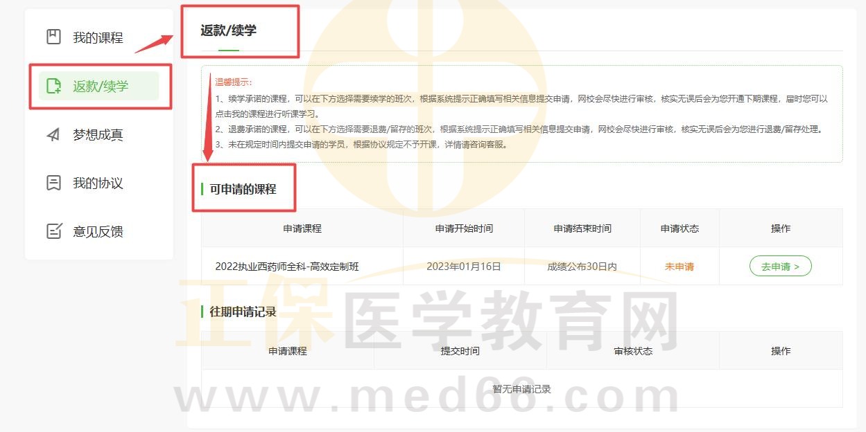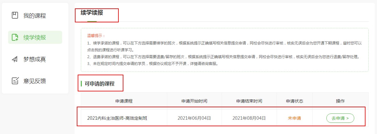 2、在“返款/續(xù)學(xué)”中找到可申請的課程,點(diǎn)擊“去申請”。
