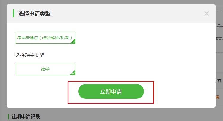 3、在彈框內(nèi)容中根據(jù)實(shí)際情況選擇申請類型,點(diǎn)擊“立即申請”進(jìn)入信息填寫。