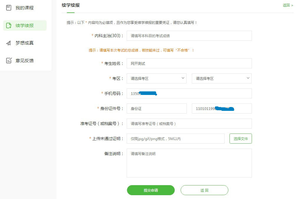 4、按照頁面要求逐項(xiàng)登記填寫返款/續(xù)學(xué)信息,確??忌彰?、手機(jī)號碼、身份證信息等內(nèi)容是否正確,然后繼續(xù)填寫續(xù)學(xué)科目及成績、考試地區(qū)、未通過證明截圖等其他信息。填寫完畢后點(diǎn)擊“提交申請”。