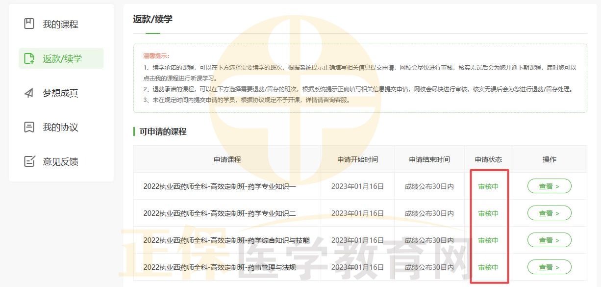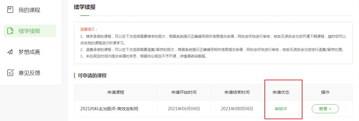6、完成續(xù)學(xué)申請??忌恍璧却头徍诵畔⒄鎸?shí)性及是否符合續(xù)學(xué)要求,審核通過后會及時為學(xué)員處理返款/續(xù)寫流程。