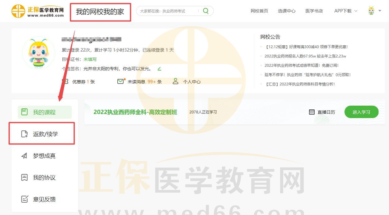 1、在“我的網(wǎng)校我的家”中找到“返款/續(xù)學(xué)”,并點(diǎn)擊進(jìn)入。