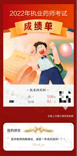【執(zhí)業(yè)藥師考生喜報(bào)】感謝醫(yī)學(xué)教育網(wǎng)的陪伴,棒棒的!