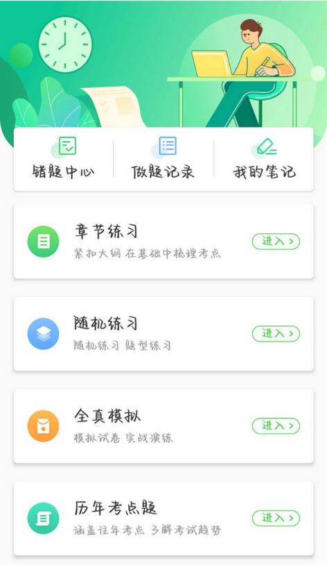 二、選擇您想要體驗(yàn)的做題模式(目前免費(fèi)試用只為您開通了各科目【章節(jié)練習(xí)】的第一章以及【全真模擬】第一卷,其余練習(xí)、隨機(jī)練習(xí)及歷年考點(diǎn)題模塊在付費(fèi)購買后開通)