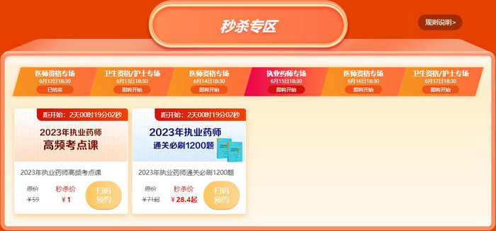 2023年6月15日18:30開設(shè)執(zhí)業(yè)藥師秒殺專場,具體秒殺商品以頁面為準,限時不限量,好課1元起!請?zhí)崆皰叽a預(yù)約,鎖定秒殺時間,超值購不要錯過!趕緊點進活動頁面掃碼預(yù)約~