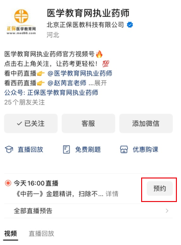 參與方式:視頻號(hào)搜索“醫(yī)學(xué)教育網(wǎng)執(zhí)業(yè)藥師”,添加關(guān)注可直接在當(dāng)前頁面進(jìn)行直播【預(yù)約】