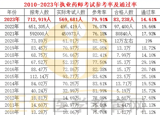 據(jù)人力資源社會(huì)保障部人事考試中心的數(shù)據(jù)顯示,2023年度執(zhí)業(yè)藥師職業(yè)資格考試全國(guó)有712,919人報(bào)考,569,681人實(shí)際參考,參考率79.91%。83,238人考試成績(jī)合格(合格標(biāo)準(zhǔn)為72分),合格率14.61%。