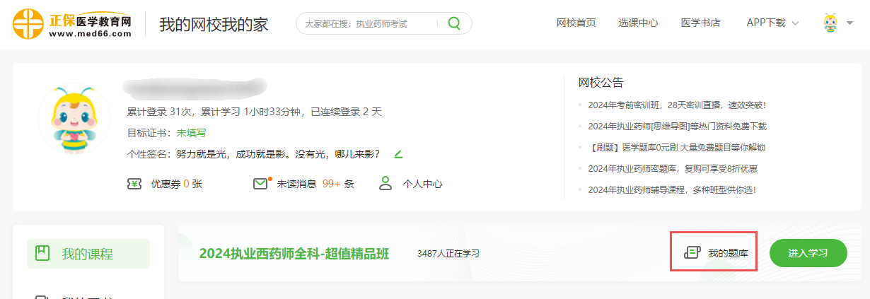 1、登錄學(xué)員賬號,進入我的網(wǎng)校我的家,選擇“我的題庫”