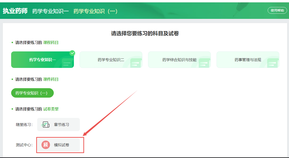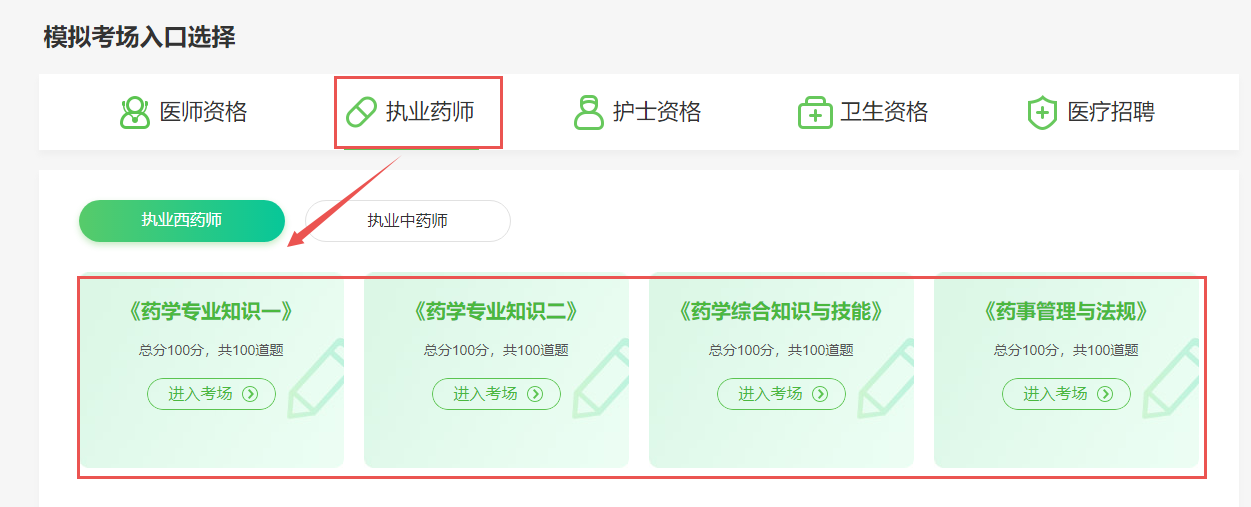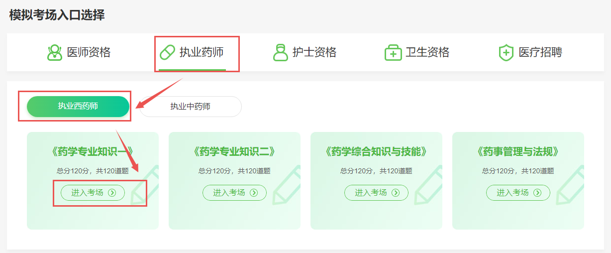 2、進入在線??冀缑?,選擇“執(zhí)業(yè)藥師”-“執(zhí)業(yè)西藥師”或者“執(zhí)業(yè)中藥師”-選擇任意試卷,點擊“進入考場”即可。