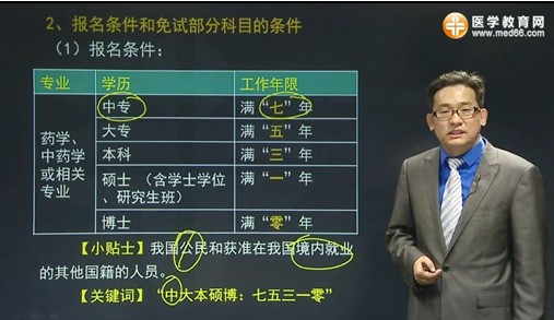 這段口訣的意思是:對(duì)中專學(xué)歷的人員要求從事藥學(xué)或中藥學(xué)專業(yè)工作滿七年;對(duì)大專學(xué)歷的人員要求從事藥學(xué)或中藥學(xué)專業(yè)工作滿五年;對(duì)本科學(xué)歷的人員要求從事藥學(xué)或中藥學(xué)專業(yè)工作滿三年;對(duì)第二學(xué)士學(xué)歷、研究生班畢業(yè)或取得碩士學(xué)位的人員要求從事藥學(xué)或中藥學(xué)專業(yè)工作滿一年;取得博士學(xué)歷的人員可直接申請(qǐng)參加考試。