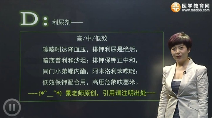 我們一起看看醫(yī)學(xué)教育網(wǎng)的景晴老師是如何講解此知識(shí)點(diǎn)的。利尿劑有一些細(xì)節(jié)問(wèn)題需要考生掌握,景晴老師并沒(méi)有平鋪直敘的用文字說(shuō)明,而是利用口訣講解。