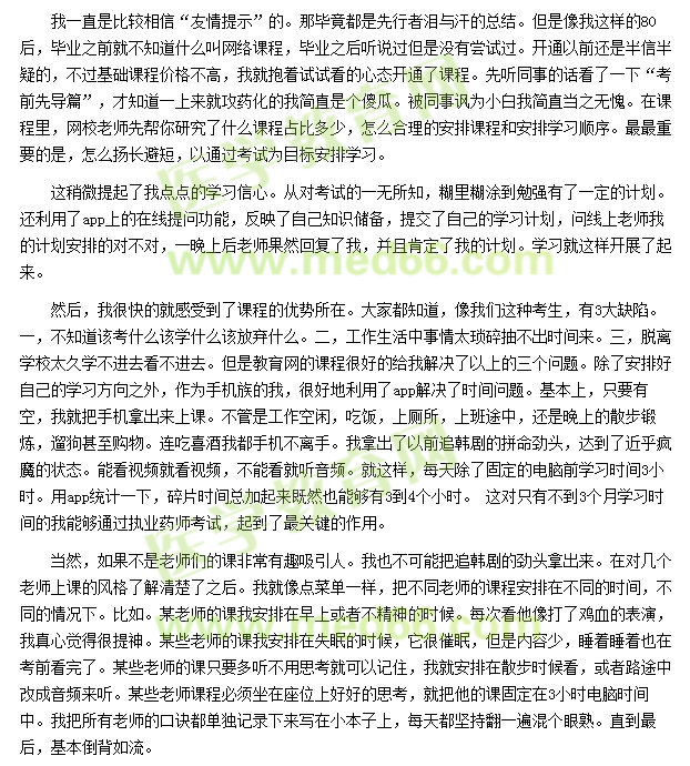 回頭想一想整個考試經(jīng)歷,如果沒有醫(yī)學(xué)教育網(wǎng)的網(wǎng)課,我可以說實話我用傳統(tǒng)看書做題的方式參加考試是絕對難以通過的,因為我已經(jīng)不是以前那個只知道讀書只能夠讀書的傻學(xué)生了。作為一名工作族,我既沒有學(xué)生狗時代的充足時間,也沒有學(xué)生狗時代的專注力,如果自己去啃課本,就算是通過,也會如同愚公移山,耗費比現(xiàn)在多很多很多的時間精力。而這些,對于醫(yī)務(wù)在職工作者來說,基本可以說是不可能完成的任務(wù)。更何況是2年3考?那些勤勤懇懇看了書付出了努力卻怎么都無法通過的同行者,為什么不試一試走上這條教育網(wǎng)給我們安排的好方法呢?有好方法后,只需要你相信它,并且依從它。我相信你之后會感謝它的。