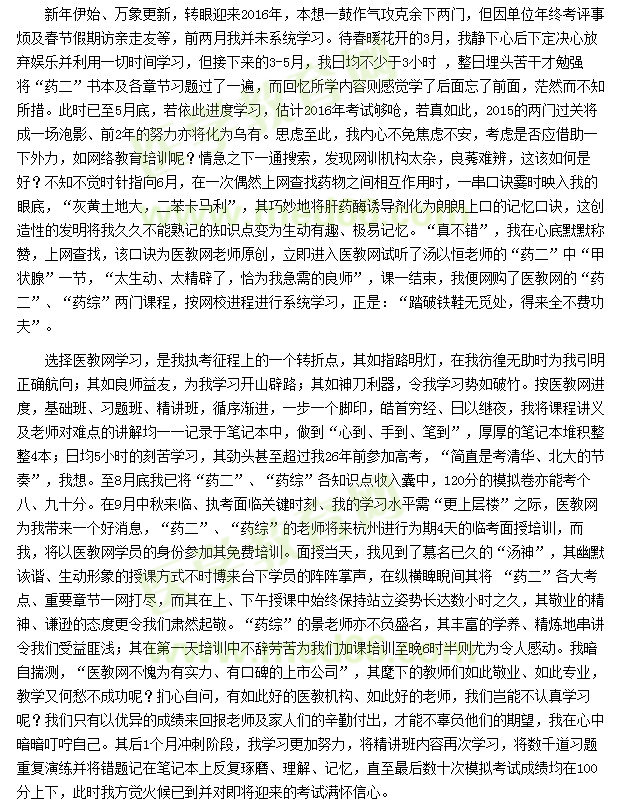 2016執(zhí)業(yè)藥師考試塵埃落定,在醫(yī)學(xué)教育網(wǎng)的精心組織、周密安排及老師們的辛勤耕耘、諄諄教誨下,我終于以藥二107分、藥綜96分的優(yōu)異成績順利通過考試(注:2015執(zhí)藥考我已通過另2門),捧上我夢寐以求、翹首以盼的執(zhí)業(yè)藥師證書。