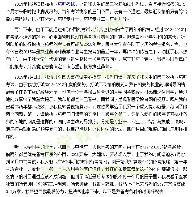 在2016年我的執(zhí)業(yè)藥師之路大型征文活動中,醫(yī)學教育網(wǎng)學員積極參與,為我們帶來了很多精彩的文章,網(wǎng)校執(zhí)業(yè)藥師學員rocke****根據(jù)自己參加2016年執(zhí)業(yè)藥師考試的經歷編寫了這篇:《我的執(zhí)業(yè)藥師之路——苦心人,天不負》,此篇文章在征文比賽中獲得了三等獎的好成績,讓我們一起來見證他(她)的醫(yī)考之路吧!