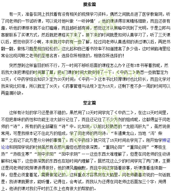 2016年,我通過了執(zhí)業(yè)中藥師的考試,說起自己的執(zhí)業(yè)中藥師考試之路,從開始的迷茫困惑到后來堅定信心的過程,這期間的個中滋味只有考過的人才能夠體會??傊?,是累并快樂著,累是因為學(xué)習(xí)過程是相當(dāng)辛苦的,我們這行工作沒有節(jié)假日,每天都要上班,晚上再晚睡覺,早上六點必須起床,很多時候也想賴床也想放棄,遇到困難也彷徨過、猶豫過,最后還是堅持了。后來離考試時間越來越近,心里就越是忐忑,基本上所有可以利用的時間都在學(xué)習(xí),但是還是感覺時間太少,有些東西始終記不住,就連晚上做夢都還在做練習(xí)題,可能這就是傳說中的“走火入魔”吧!為什么說還有快樂呢?知識的增長積累過程是快樂的,而且我的執(zhí)考之路非常順利,第一次報名就成功,從報名到考試也就只用了短短三個月時間就通過了四門學(xué)科的考試,這點同行們覺得我很厲害,但是我認(rèn)為我很幸運(yùn),是因為我選擇了醫(yī)學(xué)教育網(wǎng),是醫(yī)學(xué)教育網(wǎng)的老師們給我?guī)砹藞远ǖ男判?,為我指引了方向,我才能這么順利地通過了考試。以下是我執(zhí)考路上的點點滴滴,與大家分享。