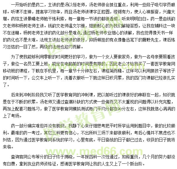 2016年12月19日,我查到了我的執(zhí)業(yè)藥師考試成績(jī),四門(mén)一次通過(guò)。感謝醫(yī)學(xué)教育網(wǎng)的湯以恒老師,景晴老師,楊樹(shù)老師,趙老師。如果不報(bào)名醫(yī)學(xué)教育網(wǎng)學(xué)習(xí),是很難通過(guò)這次考試的,就考試難度而言,沒(méi)有專(zhuān)業(yè)教學(xué)團(tuán)隊(duì)的指導(dǎo),沒(méi)有系統(tǒng)的學(xué)習(xí),是不可能一次通過(guò)的。