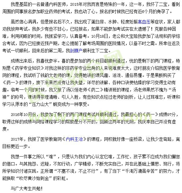 2016年我的執(zhí)業(yè)藥師之路大型有獎?wù)魑幕顒踊馃徇M行中,醫(yī)學(xué)教育網(wǎng)學(xué)員積極參與,為我們帶來了很多精彩的文章,網(wǎng)校執(zhí)業(yè)藥師學(xué)員根據(jù)自己參加2016年執(zhí)業(yè)藥師的經(jīng)歷寫了這篇:《2016我的執(zhí)業(yè)藥師之路--醫(yī)教有路勤為徑,藥海無涯苦作舟》,讓我們一起來見證她的執(zhí)業(yè)藥師之路吧!
