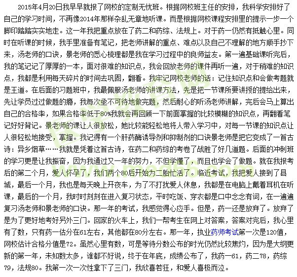 大約是2014年6月份左右,第一次審核通過,距離十月中旬的考試也就四個多月的時間。我著急的像熱鍋上的螞蟻,偏偏那一年的工作任務(wù)也特別繁重,每天都有寫不完的材料,整理不完的檔案,執(zhí)業(yè)藥師考試的四本大書就像在自己的心里長了四座大山一樣,時時刻刻壓的自己喘不過氣來。后來,有個周末,終于有了點閑暇的時間,我和幾位藥學方面的好友聊天,其中一位已經(jīng)是一名正牌的執(zhí)業(yè)藥師了,我跟他們聊聊自己糟糕的心情,那位正牌藥師一拍大腿喊道:那就報醫(yī)學教育網(wǎng)的網(wǎng)課呀!你想四個月看完四本書通過考試的可能性為零。那次聊天后,我回來就注冊了醫(yī)學教育網(wǎng)。2014年7月15號第一次就信心滿滿地報了特色直達班。說實話,在聽了幾位老師的課后,稍稍找到了點自信。由于自己拿證心切,學習聽課做題完全沒有章法,時間安排上沒有合理規(guī)劃,學習沒有掌握要領(lǐng),復(fù)習沒有抓住要害,在兩個多月的時間里,都是白天忙忙碌碌上班,晚上渾渾噩噩聽課,經(jīng)常獨自一個人在老師們精彩的講課聲中昏昏欲睡,那一段時間,我就像一具行尸走肉一樣,完全是靈魂出竅的狀態(tài)。愛心看在眼里,疼在心里,她常常勸我,咱不考了行嗎?大不了到時候關(guān)門大吉,難道咱還餓死不成?我也真想草草收兵,可是轉(zhuǎn)念一想,都走到了這個份兒上了,再走走,說不定就能峰回路轉(zhuǎn)。這么安慰著自己,覺得湯老師和景老師的課也不那么枯燥了,原諒我說枯燥,因為說實話,那些課對我一個外行來說真的就是煎熬。我給愛人說,第一年就讓我打打醬油,趟趟路子,摸摸門道。轉(zhuǎn)眼到了考試,我們要坐一夜的火車去烏魯木齊考試,在烏魯木齊的四場考試,沒有一場讓我舒心,面對哪些試題,總感覺似曾相識,從覺得都是老師們講過的,可是作起來確都顯得那么的陌生??纪旰螅倚拚撕荛L一段時間。別人考的好的都在焦急地等結(jié)果,我確沒有那種心思,反正我一門也不會過??荚嚱Y(jié)果出來,我的法律法規(guī)竟然以63分的成績低空飄過。其他的都在4、50分左右。身邊的好多朋友連一門的沒過的人大有人在呢!就這一門63分確給了我莫大的安慰。愛人鼓勵我再接再厲,我自己也暗下決定一定要迎難而上。