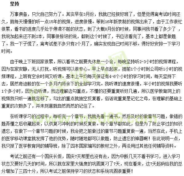 既然決定要考,不管多困難都要克服,開始慢慢準備。記得有一句話叫:平臺不對,努力白費!所以在選擇學習平臺的時候我糾結(jié)了好久,實體班?網(wǎng)絡視頻班?最后我選擇了網(wǎng)絡視頻,因為可以重復觀看里面的視頻,有聽不懂的地方可以多聽幾遍。相比較了幾個網(wǎng)絡教育平臺,最終選擇醫(yī)學教育網(wǎng),因為醫(yī)學教育網(wǎng)無論在師資實力上,還是在聲望和知名度上,據(jù)我了解都是領先的。