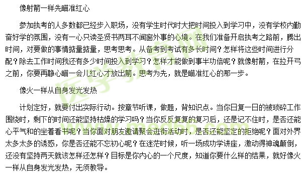 一分耕耘一分收獲。想要收獲更好,必須耕耘得好。在執(zhí)考路上會有很多艱辛,但很多事情其實(shí)都不難,最怕的是你不用心。當(dāng)你用心深入去做的時(shí)候,你會發(fā)現(xiàn)你可悟出很多的門道。老師們詼諧幽默的講課風(fēng)格,給枯燥的學(xué)習(xí)增添無限趣味。生硬難背的知識點(diǎn),一個(gè)順口溜就可以解決。一旦懂得和領(lǐng)悟,敢于挑戰(zhàn)、敢于應(yīng)戰(zhàn),在執(zhí)考之路上披荊斬棘,光明還會遠(yuǎn)嗎?考場上的運(yùn)氣就是你日積月累的實(shí)力爆發(fā)的時(shí)刻。