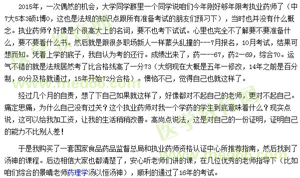 雖然不是很高的分?jǐn)?shù),但是我覺得我的一個(gè)夢(mèng)想實(shí)現(xiàn)了。執(zhí)業(yè)藥師證即將收入囊中。在此,我也想對(duì)各位準(zhǔn)備參加執(zhí)業(yè)藥師考試的同學(xué)們說一下。考試不并不難,在于你有沒有選對(duì)學(xué)習(xí)方法,有能力的自己買官方指定指南學(xué)習(xí),如果基礎(chǔ)差的就安心找一個(gè)靠譜的輔導(dǎo)機(jī)構(gòu)也可以的。