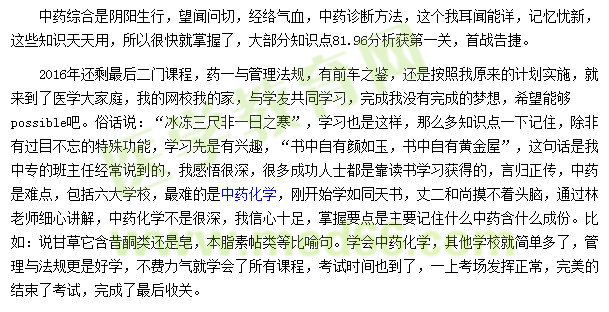 爆竹聲聲辭舊歲,喜氣洋洋迎新年,新的一年馬上來(lái)臨,一年一度的國(guó)家執(zhí)業(yè)藥師考試成績(jī)查詢的我過(guò)關(guān)了,低分通過(guò)很激動(dòng),感謝醫(yī)學(xué)者教育網(wǎng)的全體老師,我是一名臨床助理醫(yī)師,2014年報(bào)名醫(yī)學(xué)教育網(wǎng),以206分通過(guò)臨床助理醫(yī)師。學(xué)習(xí)慣了,不學(xué)習(xí)有點(diǎn)不適應(yīng),也想挑戰(zhàn)自己吧,證明自己別人能過(guò)的我也能過(guò),義不容辭就報(bào)名了,現(xiàn)場(chǎng)審核通過(guò)考藥二和綜合買了書(shū)本挺厚,不比執(zhí)業(yè)醫(yī)師簡(jiǎn)單,錢老師說(shuō)爭(zhēng)四保三,爭(zhēng)三保二,我的策略是考二過(guò)二,而且是必須過(guò),于是我報(bào)醫(yī)學(xué)教育網(wǎng),特色直達(dá)班,按部就班開(kāi)始學(xué)習(xí),凡事預(yù)則立,不預(yù)則廢,有備而來(lái),方能胸有成竹,藥二聽(tīng)著還行,因?yàn)槲覍W(xué)過(guò)中醫(yī)那引起中藥品種功能功效略知一二,再加上閆老師講課通俗易懂,口決記憶,通過(guò)講故事就把中藥功能主治藥性記住了,終生難忘,趙老師說(shuō)學(xué)習(xí)是很枯燥的事,設(shè)備好辦法,就是簡(jiǎn)單機(jī)械重復(fù),通過(guò)看書(shū),聽(tīng)課做題,三樣缺一不可,不僅學(xué)到了中藥知識(shí),還考上了證書(shū),真是名利雙收。