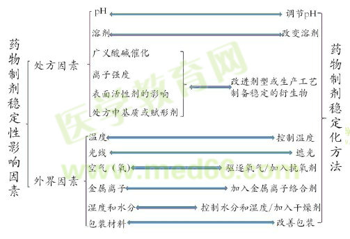 影響藥物制劑降解的因素主要有處方因素和環(huán)境因素兩方面。處方因素包括pH的影響、廣義酸堿催化、溶劑、離子強(qiáng)度、表面活性劑和處方中賦形劑及附加劑6方面內(nèi)容。環(huán)境因素包括溫度、光線、空氣、金屬離子、濕度水分、包裝材料6個(gè)方面的內(nèi)容?!踞t(yī)學(xué)教育網(wǎng)原創(chuàng)】而藥物制劑穩(wěn)定化方法主要包括改進(jìn)劑型與生產(chǎn)工藝、制成穩(wěn)定的衍生物兩方面。很多學(xué)員感覺影響因素太多,改進(jìn)方法也不少,所以不知道如何能夠快速地把這些相關(guān)內(nèi)容背記下來(lái)。其實(shí),對(duì)于這部分知識(shí)沒有必要死記硬背,只要把相關(guān)的知識(shí)點(diǎn)串聯(lián)起來(lái),結(jié)合一些生活實(shí)踐經(jīng)驗(yàn)就能輕松記住?!踞t(yī)學(xué)教育網(wǎng)原創(chuàng)】比如影響藥物制劑穩(wěn)定性的處方因素就是一些制劑本身的理化性質(zhì),像溶劑、pH等;而環(huán)境因素是一些外界環(huán)境因素,如溫度、濕度等。但這里有一個(gè)易混淆的知識(shí)點(diǎn):離子強(qiáng)度屬于處方因素,而金屬離子屬于外界因素。這里大家注意,金屬離子一般是由于工藝生產(chǎn)中的設(shè)備、溶劑引入的,所以為外界因素,而離子強(qiáng)度是本身藥物或溶劑的理化性質(zhì),為處方因素?!踞t(yī)學(xué)教育網(wǎng)原創(chuàng)】藥物穩(wěn)定化方法是依據(jù)不穩(wěn)定性因素進(jìn)行的改進(jìn)方法,如溫度、濕度影響穩(wěn)定性,我們可以制成包衣制劑,這樣可以避免光、熱、水分對(duì)藥物的影響。此外可以把這些相關(guān)知識(shí)點(diǎn)進(jìn)行總結(jié),如下圖: